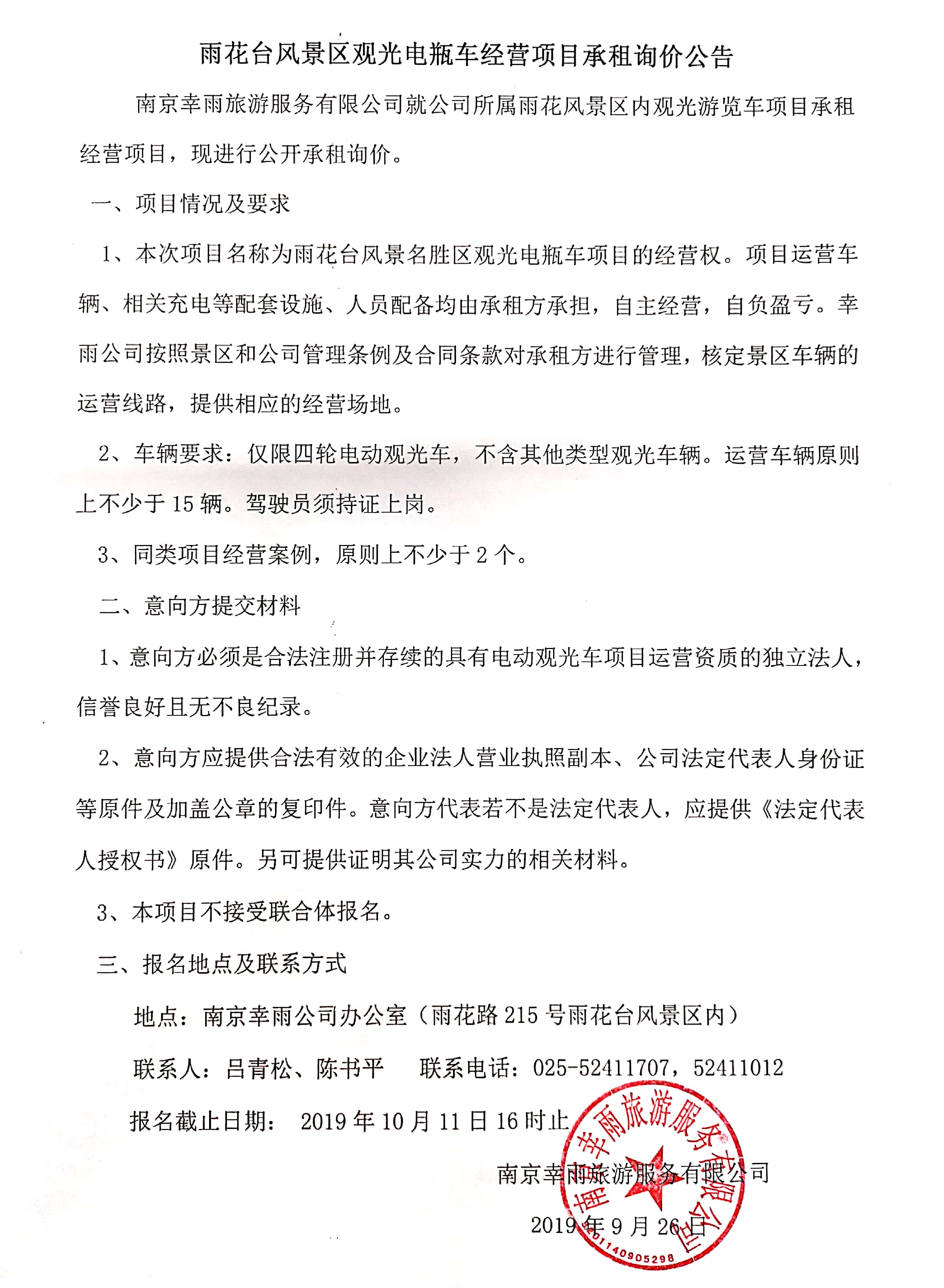 雨花臺風景區觀光電瓶車經營項目承租詢價公告